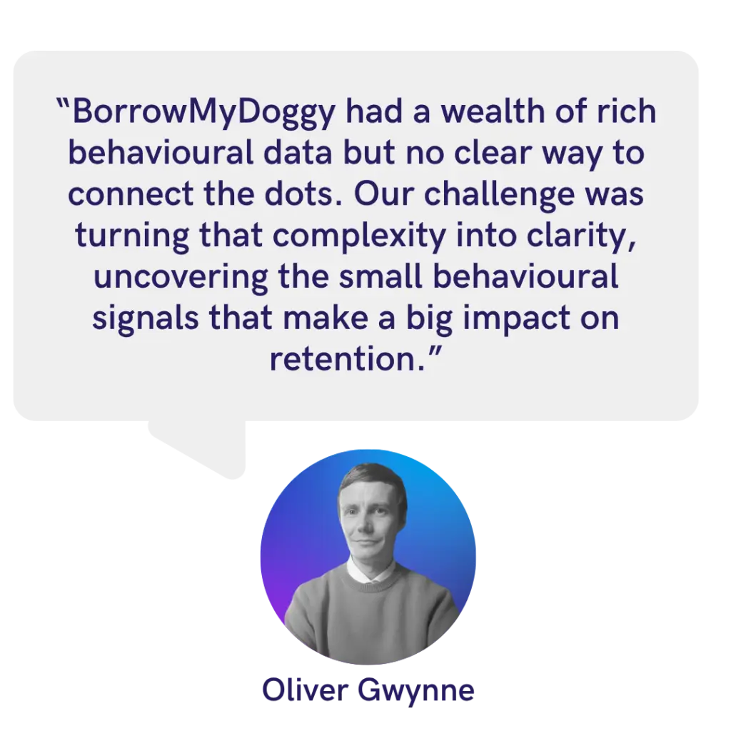 Too Much Data, Too Little Clarity: BorrowMyDoggy had years of rich transactional data, covering sign-ups, likes, searches, and subscriptions, but no clear way to interpret it. The challenge lay in connecting millions of data points into a coherent story that revealed why users stayed, left, or converted.