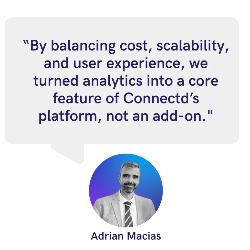 Product Integration: The second challenge was ensuring analytics worked in lockstep with Connectd’s subscription model. Insights needed to be real, actionable, and tiered appropriately, but still affordable to deliver. This required careful design decisions that married technical execution with business goals, ensuring analytics added value without adding financial strain.