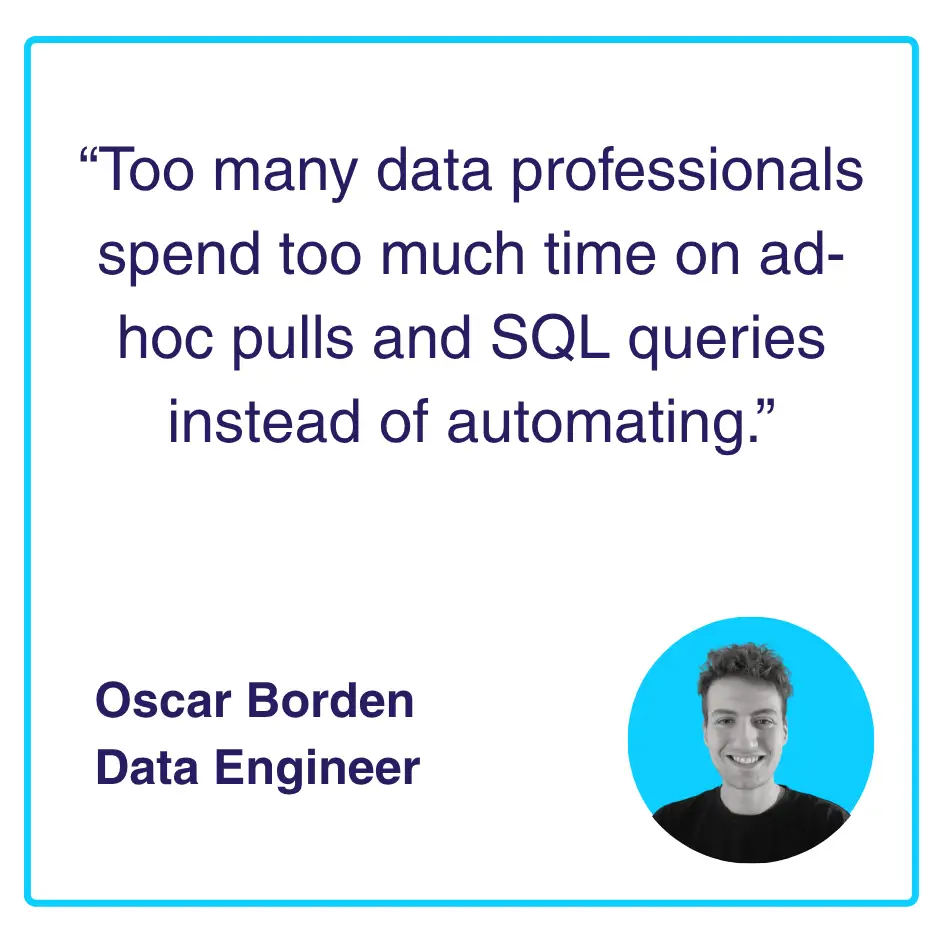 Automating processes today will save you time in the long run. The pursuit of efficiency is essential for growing your analytics, with automation at its core. Our guiding principle is: if you find yourself repeating a task, automate it, it is likely you will need to do it again. Automation can save your team thousands of manual hours, which can be redirected to fuel growth. This is akin to increasing your headcount by 10% (a conservative estimate) without having to recruit additional staff!
