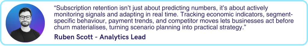 Leading indicators provide earlier warning than lagging measures. Consumer confidence shifts often precede actual spending changes by weeks or months, providing advance notice of likely subscription retention effects. Business sentiment surveys signal coming budget pressure before actual cuts materialise. Monitoring leading indicators rather than merely lagging metrics enables proactive response rather than reactive adjustment after retention already deteriorated.
