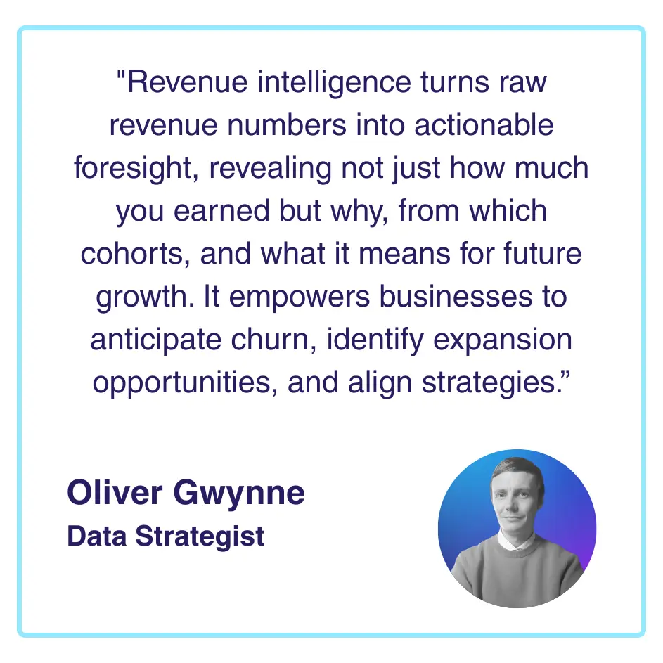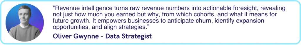 Revenue intelligence is not a feature of your finance system or a dashboard you purchase, it exists wherever your data is integrated and accessible in one place. By connecting transactional data, product usage, engagement signals, and customer characteristics, you can move beyond historical reporting to a predictive, actionable understanding of your business. It’s the synthesis of these datasets; structured, segmented, and analysed, that transforms raw revenue numbers into intelligence: insights that reveal why revenue moves, which levers to pull, and how to optimise customer value, retention, and growth strategically. Ultimately, revenue intelligence is defined not by the tools you use but by the ability to unify your data, ask the right questions, and act on the answers.