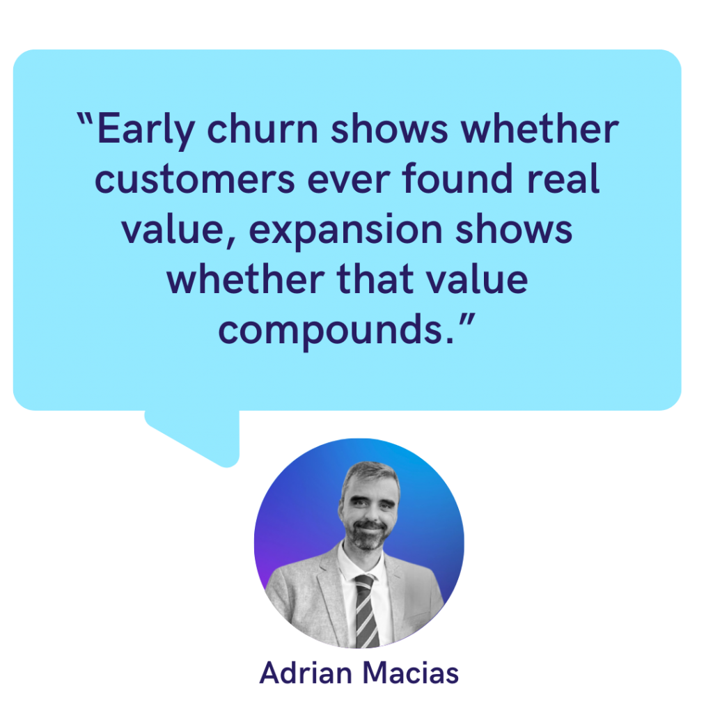 Early Churn & Expansion Dynamics: Early churn signals product-market fit or onboarding issues. Expansion rates indicate whether a “land and expand” strategy is viable. Together, they clarify whether value must be captured upfront or built over time.