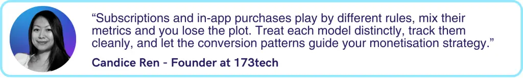 The data infrastructure must accommodate both models. Subscription platforms like RevenueCat handle subscriptions but also track in-application purchases, providing a unified view. Your analytics must segment users into cohorts: subscribers only, in-application purchasers only, users who do both. The behaviours and economics of each cohort are distinct and should inform different strategies.