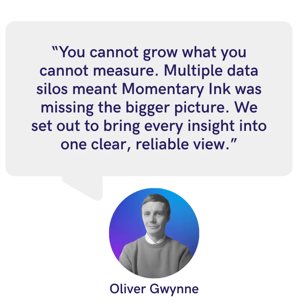Gaps: Shopify’s native analytics lacked the advanced capabilities required to answer critical questions. The team struggled to identify high-value customer segments, uncover repeat purchase drivers, and optimise marketing campaigns. Without a comprehensive analytics solution, Momentary Ink was missing key opportunities for personalisation and long-term customer engagement.