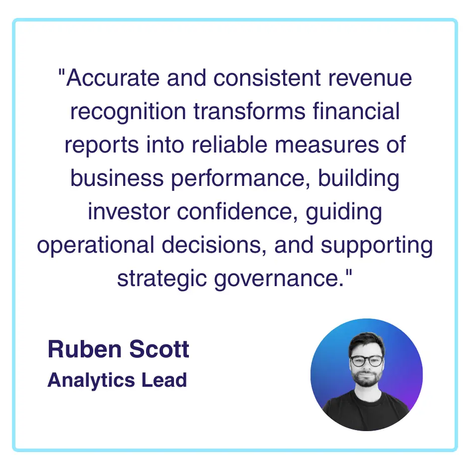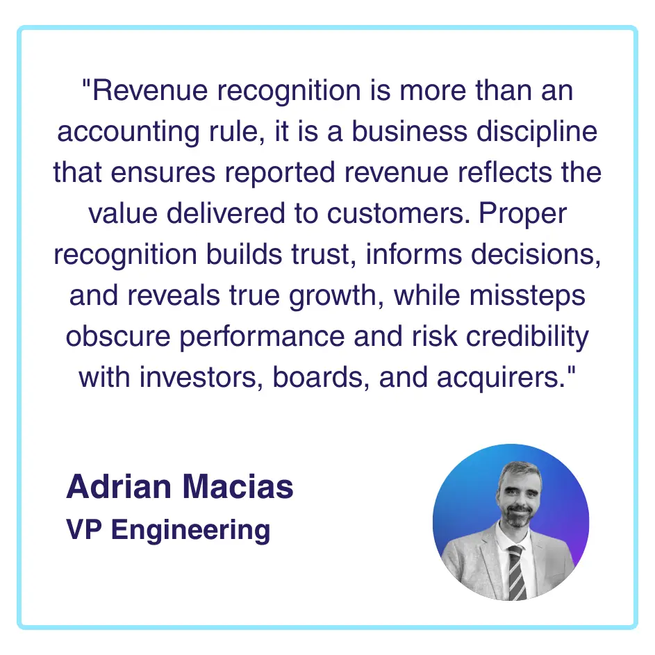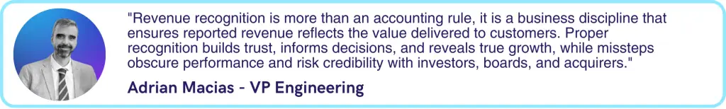 Revenue recognition done properly provides the foundation for accurate business performance measurement, enabling everyone, management, boards, investors, to understand actual business health rather than being misled by timing differences between bookings, cash, and value delivery.