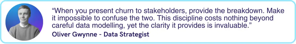 Yet many companies track only a single churn number, or worse, they conflate the two types inconsistently. A subscription that cancels voluntarily is counted as churn immediately. A subscription that fails payment is counted only after multiple retry attempts and a grace period. The aggregate number becomes meaningless, a blend of two different time horizons and two different processes. Analysing trends in such a metric is futile.