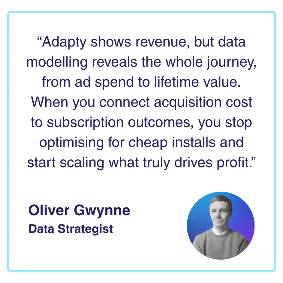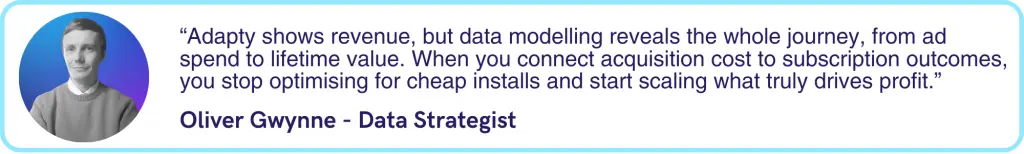 Marketing teams often optimise on cost per install (CPI) or trial conversion rates because that’s what is visible. But without tying acquisition cost to downstream subscription value, you’re making decisions in the dark. Some campaigns that look “expensive” on CPI can be the most profitable once retention is factored in. Warehouse modelling closes the loop between acquisition spend and subscription value, giving you the confidence to scale the right campaigns.