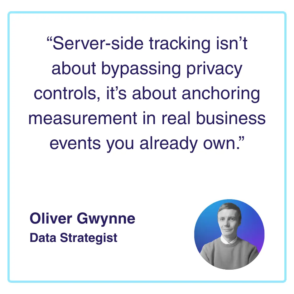 Unlike client-side tracking, which depends on JavaScript executing in user browsers and remains vulnerable to blockers and consent limitations, server-side tracking captures events directly from your own infrastructure. Server-side tracking offers several compelling advantages. When a user completes a purchase, upgrades their subscription, or cancels their account, your backend systems process these events as part of normal business operations. Server-side tracking simply ensures that these business events also flow to your analytics and marketing platforms, creating a complete record of customer behaviour regardless of browser settings or cookie consent.